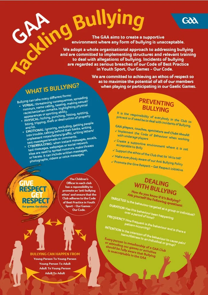 We recognise that incidents of bullying are a serious breach of the Code of Behaviour and of our “Give Respect - Get Respect” initiative and all such incidents will be dealt with accordingly. Our duty and challenge as Club leaders, coaches or parents is to challenge, counteract and eliminate such unacceptable behaviour through awareness, education and proactive measures that are based on inclusivity and respect for all in St Peregrines GAA Club.
